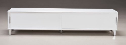 Includes TV stand only. Flush mount chrome handles custom fit in door depressions 3D press technology used through out providing an "infinity edge High gloss solid white finish The sliding top allows the credenza to expand and incorporate a storage ottoman